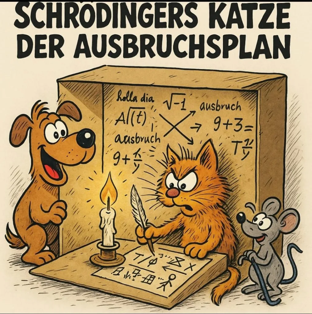 Nach langem orakulösem Nachsinnen habe ich diesen „wahrscheinlichen“ Ausbruchsplan bildlich festgehalten – samt Kerze als Lichtquelle, Katze als genialem Kopf, Hund als stillem Komplizen und Maus als cleverem Assistenten. Ich hoffe, die Zeichnung gefällt Euch – meinen treuen Leserinnen und Lesern – mindestens so sehr, wie sie mir nach der x-ten Hustensaft-Einnahme gefallen hat. 😁