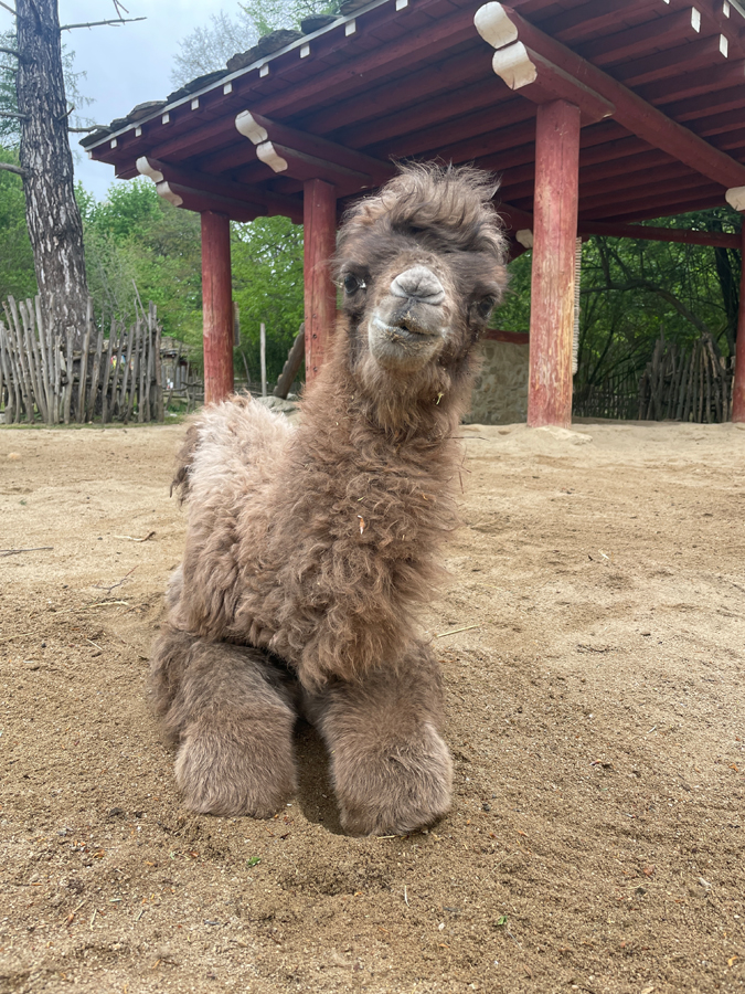 Am Sonntagvormittag geht dann alles sehr schnell. Plötzlich sind Füße und Kopf des Fohlens zu sehen und nur 20 Minuten später ist das ganze Kamelfohlen da – eine Blitzgeburt. Und das Ganze unter den interessierten Blicken der neugierigen Mitbewohner der Gemeinschaftsanlage sowie der faszinierten Tierparkbesucher.
